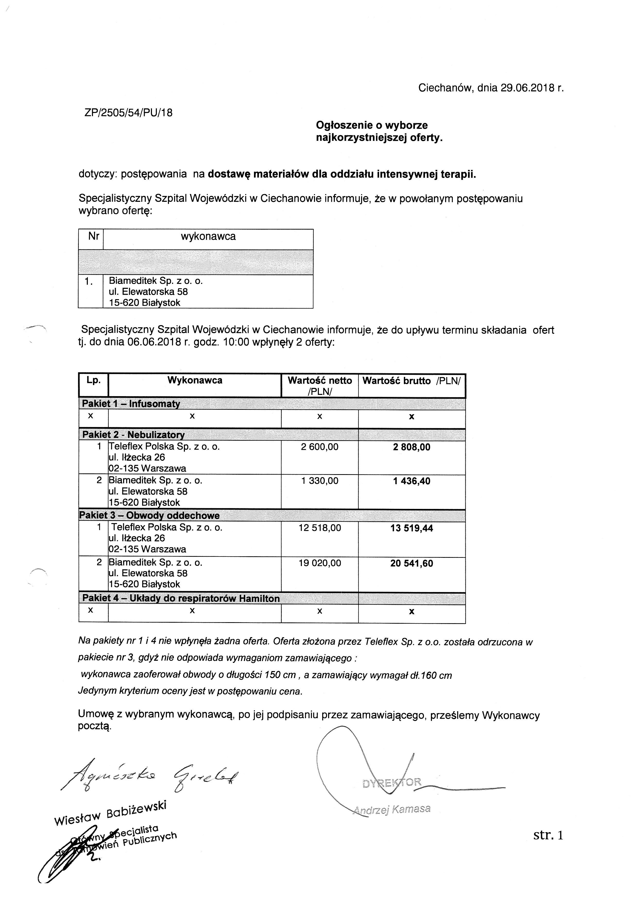Ogłoszenie o wyborze ofert 54PU18
